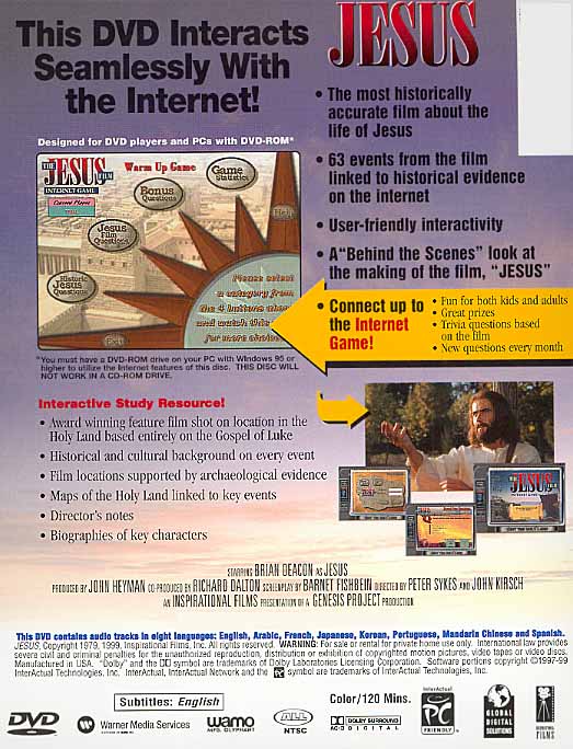 - When played on a computer, this DVD interacts seamlessly with the Internet! (Windows 95 or higher) You can then get much more information about Jesus. Play games, trivia, etc. Biographies of key characers, maps of the Holy Land linked to key events. Biblical references. Director’s notes. Historical and cultural background on every event.