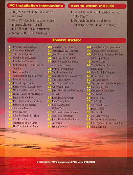 DVD DISC FEATURES…- 63 events in Christ’s life are indexed - making it perfect showing this video in segments, if you so desire. This is great for Bible studies and Sunday schools. Show a segment and then discuss it. You can later resume the movie at many different points using the handy, on-screen “Choose a Scene” menu.