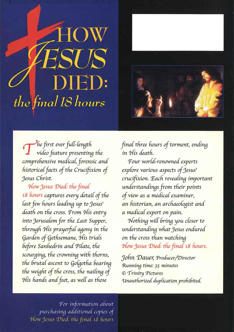 How Jesus Died: The Final 18 Hours captures every detail of the last few hours leading up to Jesus' death on the cross. From His entry into Jerusalem for the Last Supper, through His prayerful agony in the Garden of Gethsemane, His trials before the Sanhedrin and Pilate, the scourging, the crowning with thorns, the brutal ascent to Golgotha bearing the weight of the cross, the nailing of His hands and feet, as well as those final three hours of torment, ending in His death.