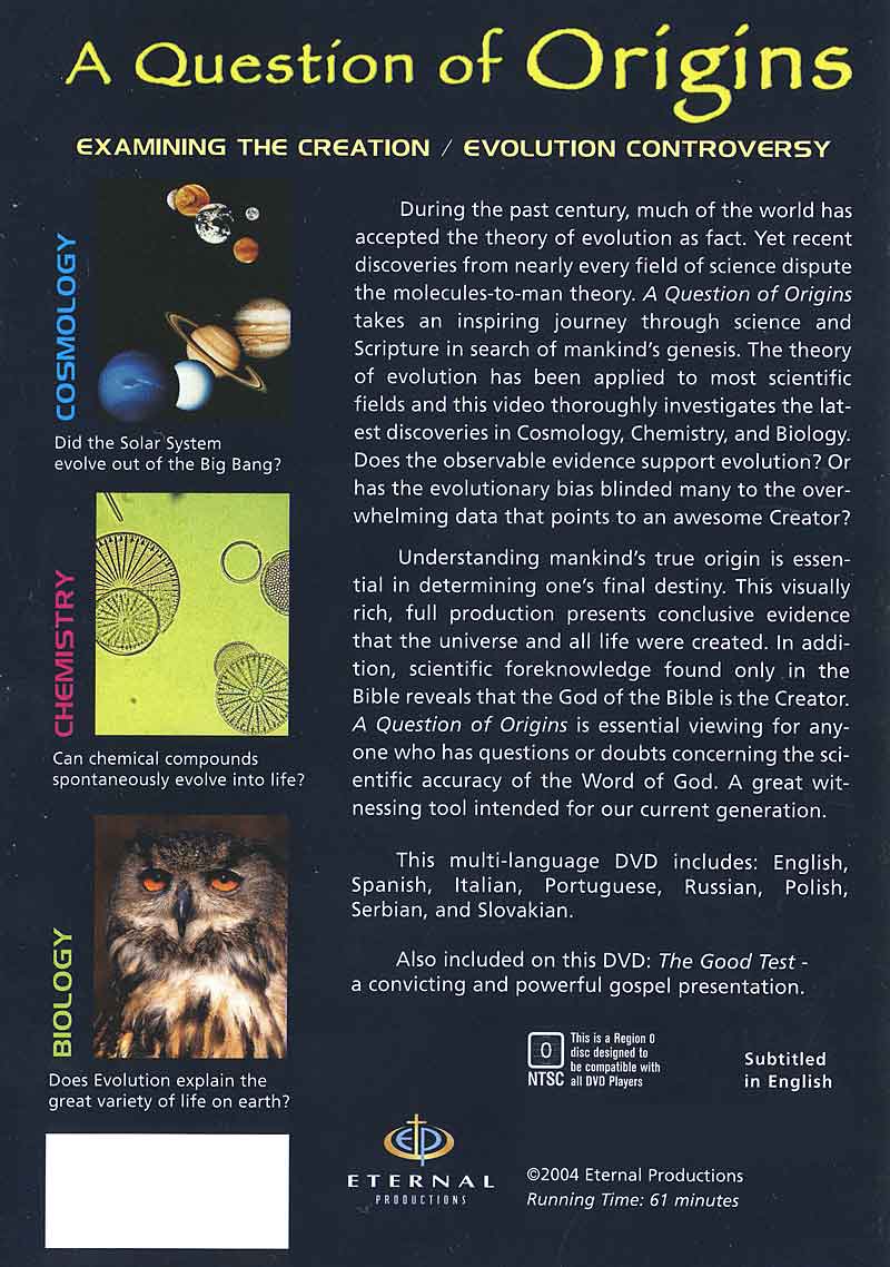 During the past century, much of the world has accepted the theory of Evolution as fact. Yet the molecules-to-man theory has no direct evidence to support it at all. This film provides overwhelming evidence in favor of Creation. The theory of Evolution has been applied to most scientific fields and this film exposes the blind speculation and evolutionary bias in three areas of science: Cosmology, Chemistry and Biology.