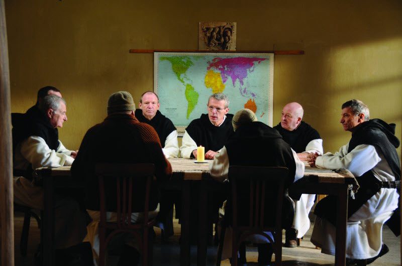 I don’t often see a movie that has enough conviction and purity of heart to make me confront the superficiality of not just my movie-going experience, but of my life itself. The French film, “Of Gods and Men”, directed by Xavier Beauvois and written by Beauvois and Etienne Comar, is such a movie. It takes on what has become a touchy, often inflammatory, subject these days: the relationship between Muslims and non-Muslims in a politically charged atmosphere. The setting is not Palestine or the Paris suburbs or lower Manhattan or an Ivy League campus. It is a small monastery in a small town in Algeria during that country’s civil war which took place during the 1990s. It is based on the true story of seven monks who were kidnapped from a monastery in Tibhirine, Algeria by Muslim extremists, and beheaded. Although an Islamic group claimed responsibility for what seems to be a signature crime, questions have recently been raised about whether the Islamists were actually culpable or whether the Algerian army may have been involved. Some believe that the atrocity was an “inside job”, a charge that is applied to almost all terrorist attacks these days. “Of Gods and Men” is an austere but gripping drama that keeps the war in the background as it focuses on everyday work and prayer in a way that initially seems tedious, but, over the course of the film, becomes engrossing and revelatory. It calmly depicts the way in which daily life’s small details are the stones that build the foundation for major accomplishments, and even for acts of heroism. The film’s drama and impact lies not in depicting how hard it is to do the right thing, but how hard it is to understand what the right thing to do actually is. Uncovering the mystery behind the beheadings is not the goal of the film. Instead, Beavois lets the details of daily life in the monastery and the village unfold delicately as danger moves recklessly toward the church walls. Battles may rage outside the monastery grounds, but inside, the monks recite daily prayers, sing hymns, bottle preserves, wash dishes, plant crops and herd goats. The townspeople come daily to the monastery’s medical clinic to have their ailments treated by Brother Luc who, though elderly, frail, and asthmatic, devotes himself to the care of the villagers and toils against great odds (insufficient medicine and supplies, threatening terrorists) to heal, comfort and clothe his patients. As the terrorist threat puts the monastery in increasing danger, the monks must decide to stay on or to leave. Would they foresake their vow and their mission if they leave? Are they prepared to accept the call to be martyrs if they stay? The film makes the point that martyrdom is not something that one seeks; it is what is left when all other options have been exhausted. The film was shot in an abandoned monastery in Northern Morocco. The splendid cinematography by Caroline Champetier doesn’t just bring to mind the bucolic meadows of Robert Bresson’s “Balthazar” or the alluring cliffs of Michael Powell’s “The Black Narcissus”; it also recalls the classic landscape paintings of Millet and Corot, and even Rembrandt. Speaking of Rembrandt, there is a great scene when the monks celebrate a meal together after they vote on how and where to spend their future—and before that future takes a tragic turn. Up to this point, the camera kept its subjects at a somewhat cool and analytical distance; in this scene, it zooms in and captures the faces of the men in close-up as they drink their wine and listen to Tchaikovsky’s “Swan Lake”. Their faces, elegiac and mournful, hopeful and resigned, determined and confused, have the same heart-gripping impact as do the Dutch master’s portraits. The scene is staged as a Last Supper, but not with the ironic Last Supper imagery of Robert Altman’s “Mash” or Luis Bunuel’s “Viridiana”. “Of Gods and Men” has a tenderness that makes these moments some of the most moving ever to be put on film. The ensemble cast is sterling. Michael Lonsdale as the ailing but devoted Brother Luc and Oliver Rabourdin as the troubled, sometimes defiant Brother Cristophe are standouts, but Lambert Wilson (known to American audiences as the Merovingian in “The Matrix” movies) as Brother Christian, the monk’s leader, is a revelation. Christian lives his Christian faith in a way that embraces Islam, but still holds firmly to the truths of his own belief. Wilson portrays Christian’s moments of doubt, frustration, anger and determination with understated passion and with consummate empathy. It is an eloquent performance, one that reveals a good leader’s ability to feel for those he shepherds, but more importantly, that most honorable trait in any leader: the ability to listen. There is a bit of foul language in the film, by a monk no less. There is more than a bit of violence, to be expected when the setting is a civil war. The beheadings are not shown on camera. “Of Gods and Men” is a remarkable film that in these times when we hear so much about tolerance and outreach, gives us an understanding of what outreach really means. It’s more than an extended hand. Real outreach means giving oneself at the same time it means acknowledging, stating, and acting on what one knows to be true. I saw “Of Gods and Men’ at the New York Film Festival on Manhattan’s Upper West Side. After the film there was a question-and-answer session between the filmmakers and the audience. There was a lot of talk about tolerance, Islamophobia, and religiosity (I still don’t know what that word means). Someone in the audience expressed concern that the film could be used by Ground Zero mosque opponents to further their cause to have the mosque construction site moved elsewhere. The director seemed intimidated by the question, although he answered it by referencing the U.S. President’s apology speech in Cairo and the need for more such outreach t