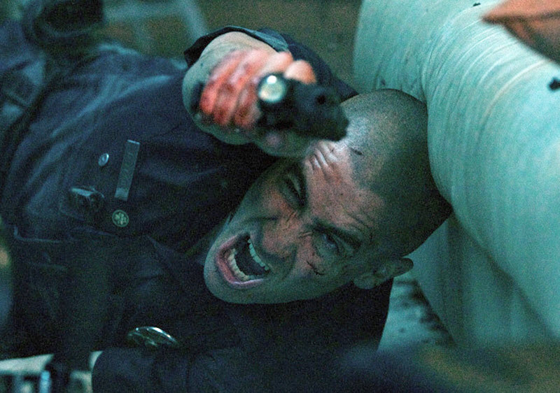 Violence: The film is filled with shootouts and fistfights, and there is plenty of bloodshed. However, not every scene is entirely graphic. In one scene, the officers discover that a man has tied up children and placed them in a closet (not graphically violent, but still disturbing). There is also a scene with a house fire (not graphic, but very intense). A woman is beaten (impact not seen, but heard, and we see the man beating her from behind). We see her bloodied face. In another scene, we can hear someone being beaten from the outside of a house. Later on in the film, we a see an officer with a knife handle protruding from his eye socket (very graphic). The officers also make a very disturbing discovery of dismembered body parts bagged up and scattered throughout a room of a house (the audience sees everything, from blood to heads to limbs, and it’s extremely graphic). In one big shootout scene, characters are shot in the head, chest, and back, and blood is sprayed everywhere.