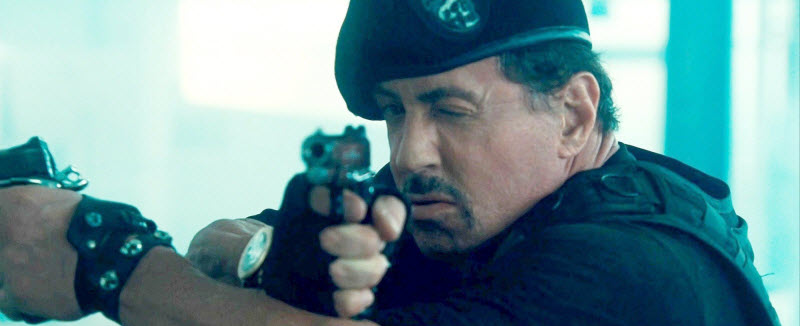 I really enjoyed the way the actors played on the fact that they had been around awhile. At the end, when the actors are given an old prop plane to go home in, one comments that it belongs in a museum. Another one retorts that they all belong in a museum. Overall, if you can stand the blood and violence, I think it is a good movie for older teens to see. Moral rating: Average / Moviemaking quality: 5 —Matthew K, age 21 (USA) Positive—I did not see this film in theaters. I saw it on DVD. After the action-in-the-dark “Fun” in “The Expendables,” I was hoping that the sequel would at least have some, if not all, of the action occurring in daylight. When I read that Chuck Norris (“Walker Texas Ranger”) had joined the cast and requested that the swearing be removed as the sole condition for him to appear in the film, I was pleased to read that there are some Christians in Hollywood who stand up for their faith (sadly, not enough do; but I digress). I was even more pleased when I read that the producers of the film (in addition to starring in and producing the flick, Stallone was also a co-screenwriter) had acquiesced to Mr. Norris” request and all strong profanity was eliminated from the script.