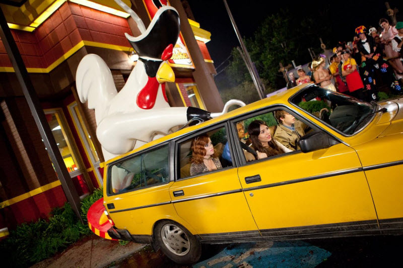 During the party the mom attends, she is sitting on a couch trying to call Wren and see how every thing’s going when the boyfriend’s friend sits on the couch next to her and passes gas into her phone. Also, on that same couch, there is a girl in a sexy red costume sitting in someone’s lap, and it appears they’re… well, you get the picture again. When Wren and the group go to a pirate chicken restaurant that is one of Albert’s favorite places to visit, there’s a mishap and the giant chicken on top of the restaurant falls off, lands on top of the car in such a way that it looks like it’s having sex with the car. April wants to get out of there, and tries to climb out the windows. I missed something from this conversation, but there is a negotiation between April and Peng that if he let her do something (I think if he let her leave), she would let him feel her boobs, and they negotiate the terms of how long, and he insists it be on a cold day.