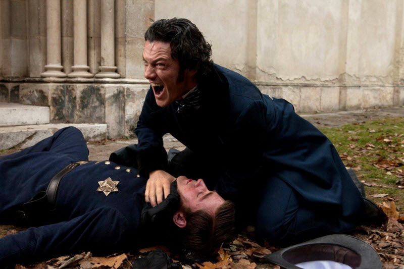 The story begins with, and includes, several murders that start to take on the aspect of some of Poe’s written works. Inspector Fields (Luke Evans, “Clash of the Titans,” “Immortals”) investigates the first horrendous murder of a woman and child, involving one of the bodies being stuffed up a chimney, as well as a second one of a man sawn in half by a pendulum. During the investigations, he figures out similarities, and believes there is a connection between the murders and Poe’s stories. Edgar Allan is currently working for the local newspaper as a writer and is brought into the investigation. Thus, between the two of them, they start trying to unravel clues and discover the identity of the killer. Meanwhile, Poe’s romantic interest, Emily Hamilton (Alice Eve, “She’s Out of My League,” “Sex and the City 2”), becomes a victim of the killer who kidnaps and buries her alive in a wooden box beneath the floor. Now Poe is desperate to find the killer and save Emily in the process. He is so desperate that he comes up with a unique plan to exchange his life for hers.