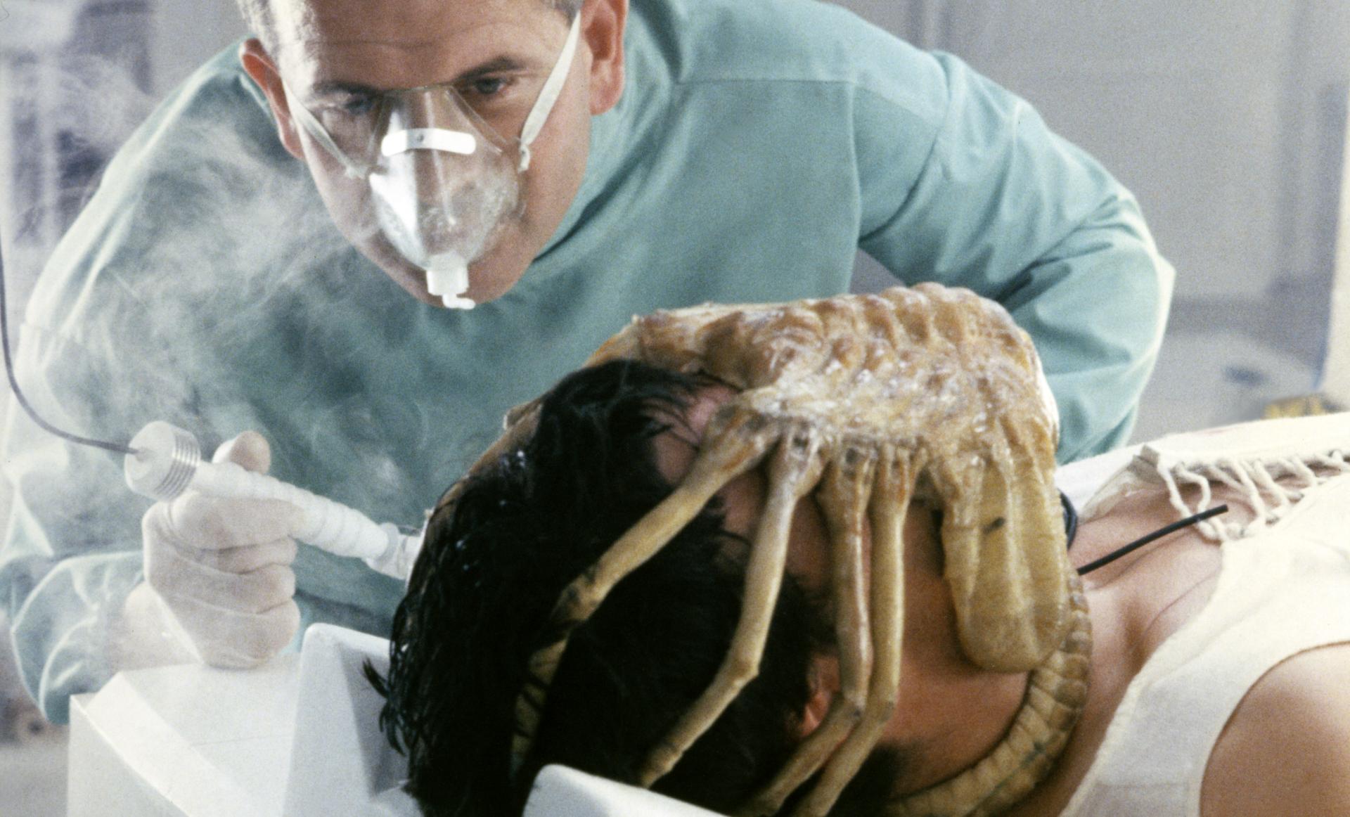 The alien, created by H.R. Giger, is a complex organism: a xenomorph with “alternation of generations.” The “sporophyte” generation [the “Face-hugger” form] hatches from an egg, vaguely resembles a crustacean and implants an embryo of the (presumably) “gametophyte” generation into any available host. The gametophyte [the “Warrior” form] bursts from the host when mature, grows rapidly to human size, and has aspects of a reptile and of an insect or arachnid. The alien (both forms) also has some formidable fighting characteristics, both offensive and defensive. In short, it’s the stuff that nightmares are made of. The tagline is “In space, no one can hear you scream.”