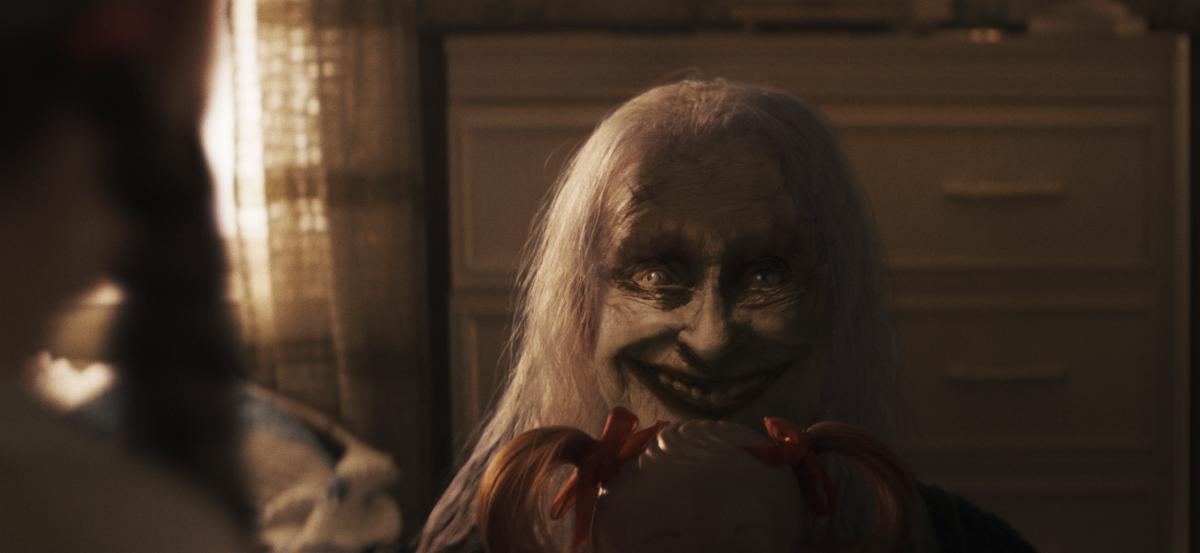 A story is shared about a farmer who axed both his wife and his mother in a crazed state of mind. The doll Annabella comes to life, grows in size and pushes a woman down the stairs. A girl bleeds profusely from the nose. A giant mirror lands on a character’s legs. Someone crashes their car. A demon pushes someone down the stairs… again.