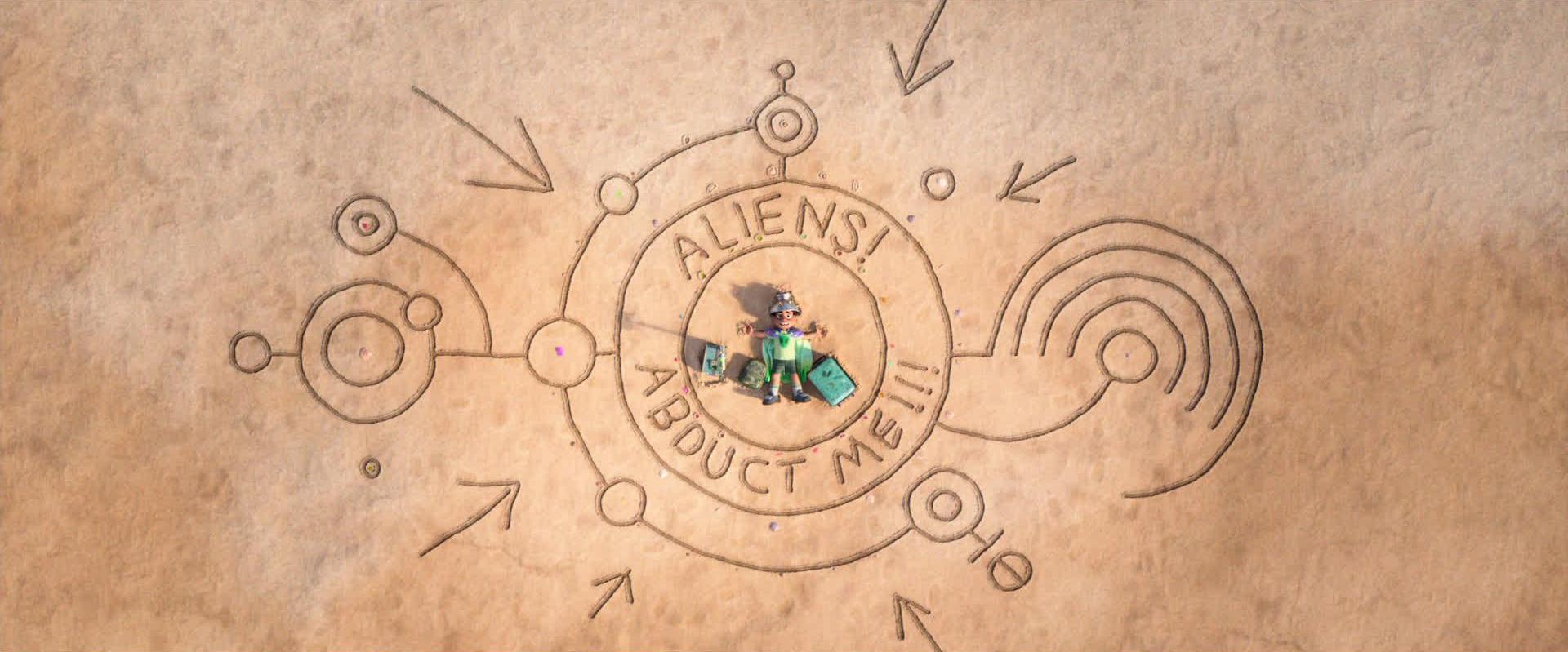 Upon hearing this, Elio wanders outside and onto the beach, drawing a bullseye and the words “Please come abduct me” in the sand.
