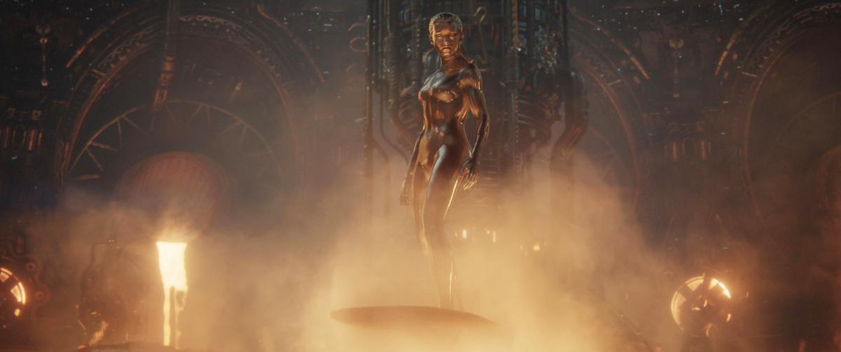 Joined by the other members of the team, Sue’s brother, Johnny aka The Human Torch (Joseph Quinn) and Reed’s best friend, Ben aka The Thing (Ebon Moss-Bachrach) they begin celebrating the happy turn of events. Almost immediately they are interrupted by a cosmic being known as The Silver Surfer (Julia Garner) who, flying in from space, informs the whole world that she is the herald of Galactus and that the planet’s end is coming.