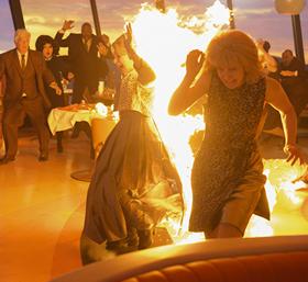 VIOLENCE: Extreme. I had over a page of violent content on my clipboard! That’s the most I’ve ever had. Here we go. The first scene is a rather lengthy scene in which A boy drops a penny from a tower and a guard warns him that they could kill a person from that height. A glass floor that everyone dances on in the tower begins to crack and dozens of people fall to their death, hitting the support beams on the outside before splattering as they hit the ground (yes we actually see people splattered on the ground). One character is even skewered in this seen. Three people catch on fire during the chaos. People fall through the side wall of an emergency staircase and fall to their deaths. A glass window breaks with people leaning on it, while a baby grand piano falls on the individuals and then on a child outside of the tower, completely splattering him. Someone’s finger is sliced off. Someone is sliced in half (we see their insides). This was all just ONE scene.