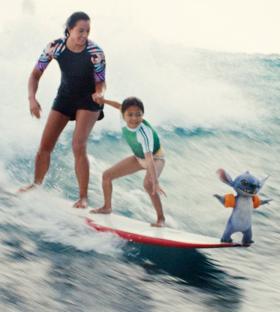 SUGGESTIVE/SENSUAL DIALOG/SEXUAL INNUENDO: A male character tells Nani, “I love shredding you” (he’s trying to tell her he loves watching her surf and loves surfing with her, it just comes out wrong because he has feelings for her). In his attempt to fix his blunder he then states “I love watching you…” and then just gives up. Lilo tells David, Nani’s best friend, that Nani thinks David’s butt is “big and fancy.” Just like the original film, Pleakely occasionally wears some feminine attire and comes out somewhat effeminate