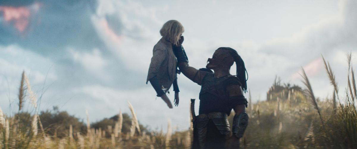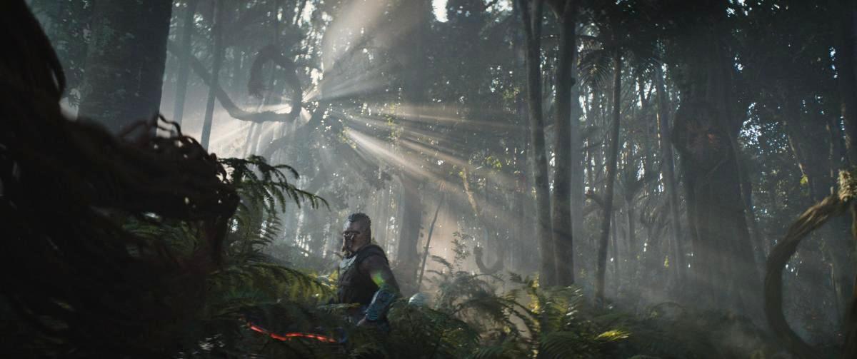 As he comes within inches of being paralyzed and eaten by various wildlife he runs into an asset (or what he refers to as a “tool”) in the form of Thia (Elle Fanning), an android who was part of an all-android landing party financed by the Weyland-Yutani corporation. Of course if you recognize the name Weyland-Yutani you know it’s the evil corporation highlighted in all the Alien movies. The talkative and almost ditzy Thia is missing her legs and isolated in the jungle when Dek finds her. Thia’s android sensibilities start as curiosity and continue into constant yammering as she buffets Dek with questions upon questions much to Dek’s chagrin. He can understand her because she conveniently has a universal speech adapter at play and is helpful to him as a tool since she can access many facts about the dangerous environment. The back-and-forth between the two is nothing you haven’t seen before in a buddy cop movie but the constantly dangerous environment, plus discovering what actually goes through a Predator’s mind, makes for interesting viewing.